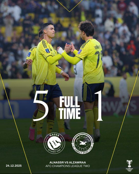 北京时间12月25日0:00,亚冠二级小组赛第六轮,利雅得胜利主场迎战扎瓦拉体育。上半场科曼推射闪击得手,韦斯利抽射扩大比分,阿姆里头球再下一城,C罗助攻菲利克斯破门,下半场托米瓦低射扳回一城,科曼破门完成双响,最终利雅得胜利5-1扎瓦拉体育全胜头名出线。